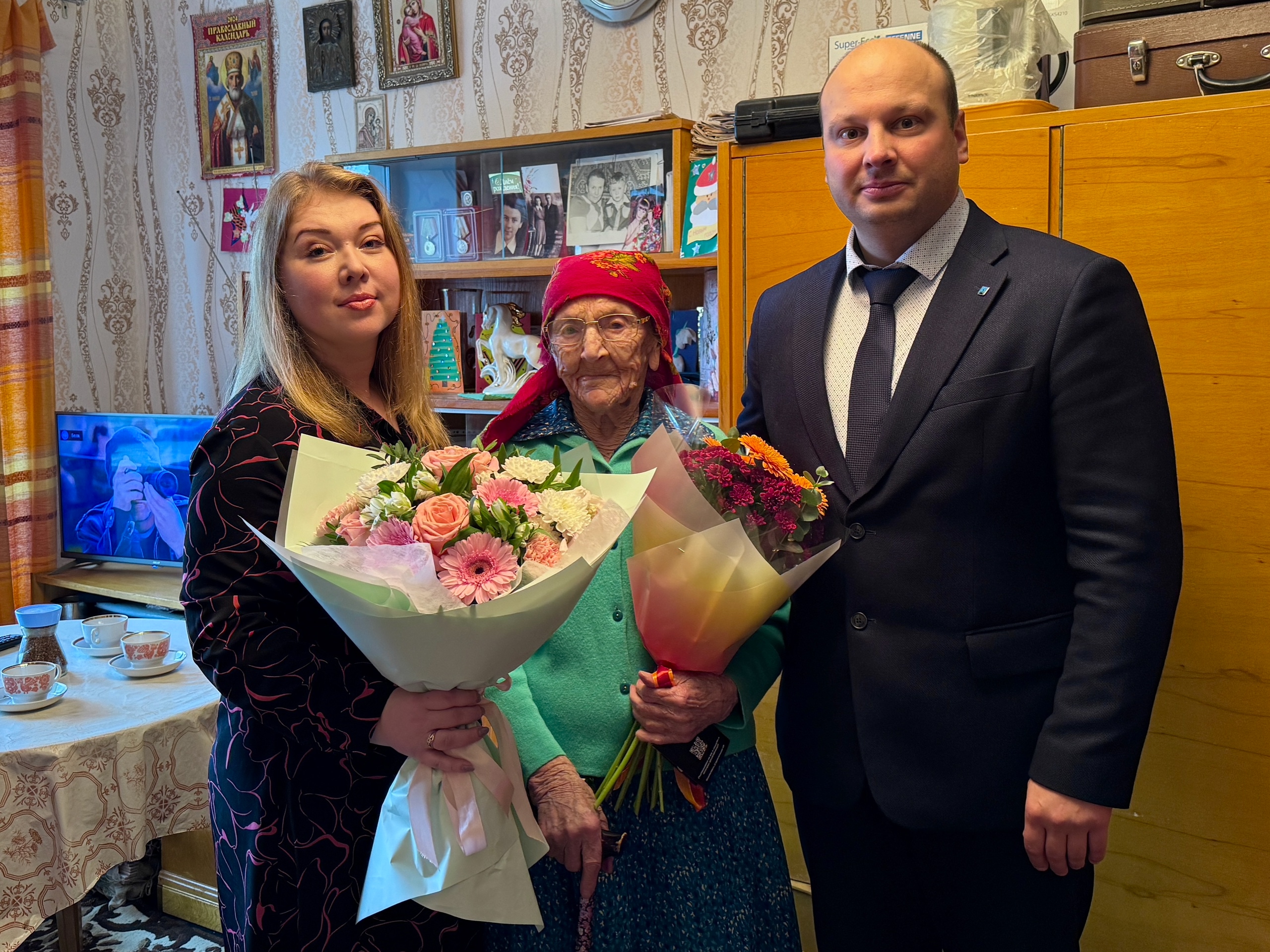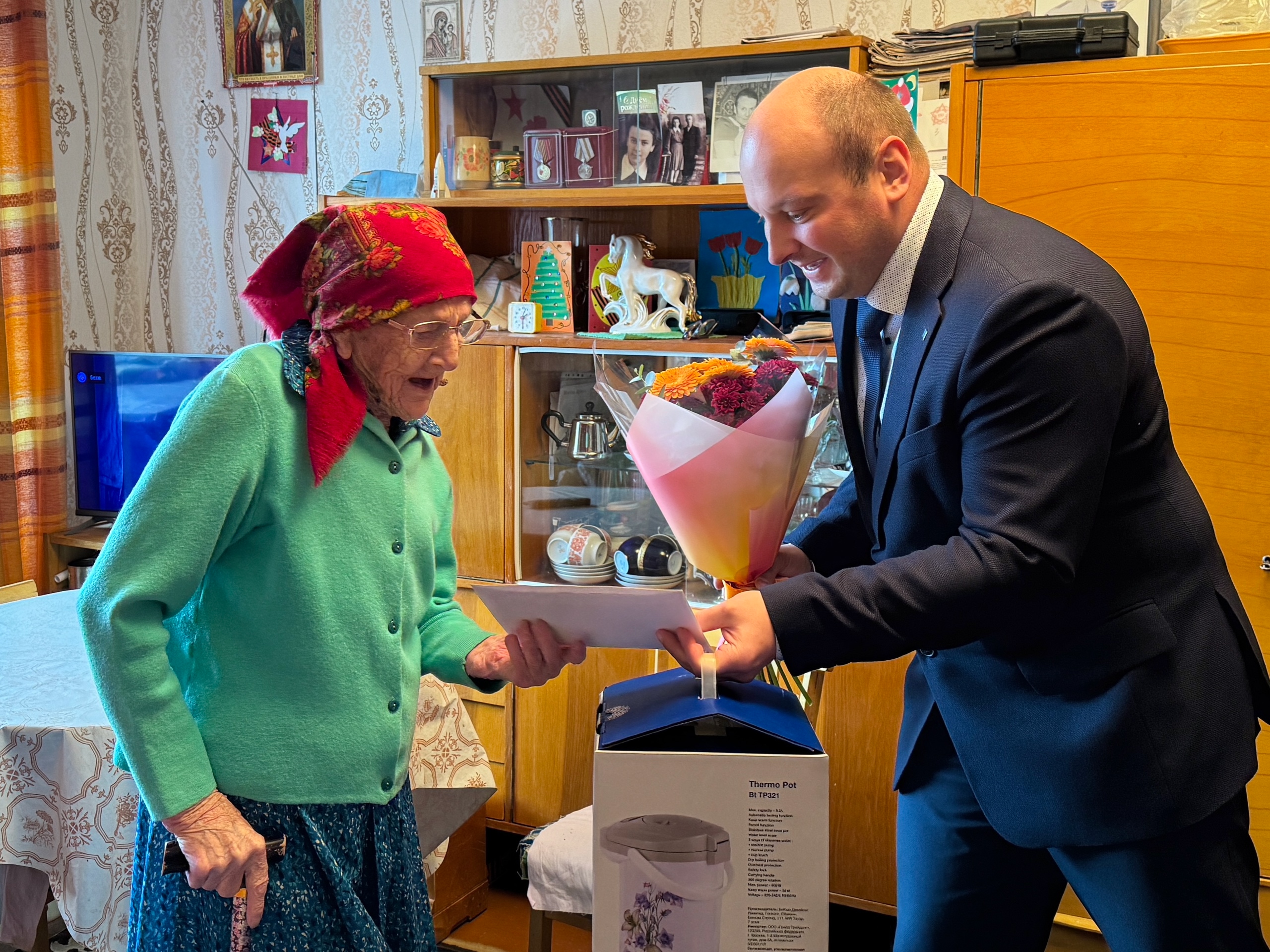 В честь юбилея Антонине Андреевне было передано поздравление от Президента России В.В. Путина. Вручение состоялось при участии начальника отдела соцподдержки Яны Сайпашевой.