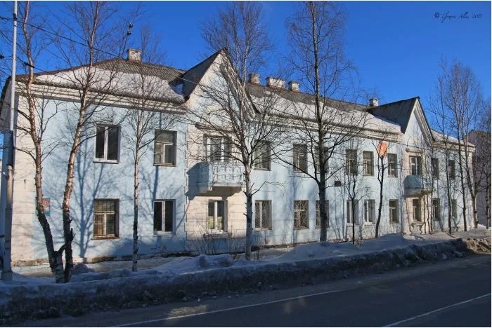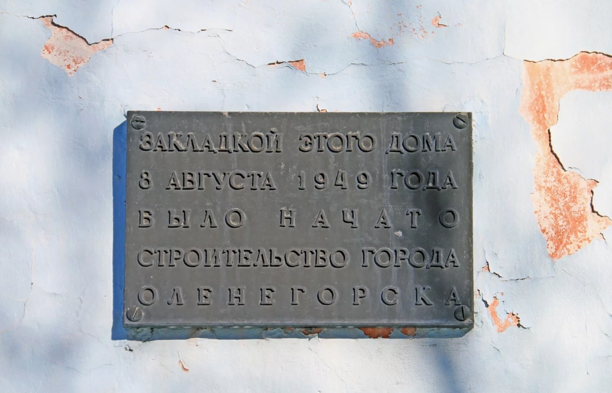 Фото первого дома Оленегорска и мемориальной таблички — из свободных источников.