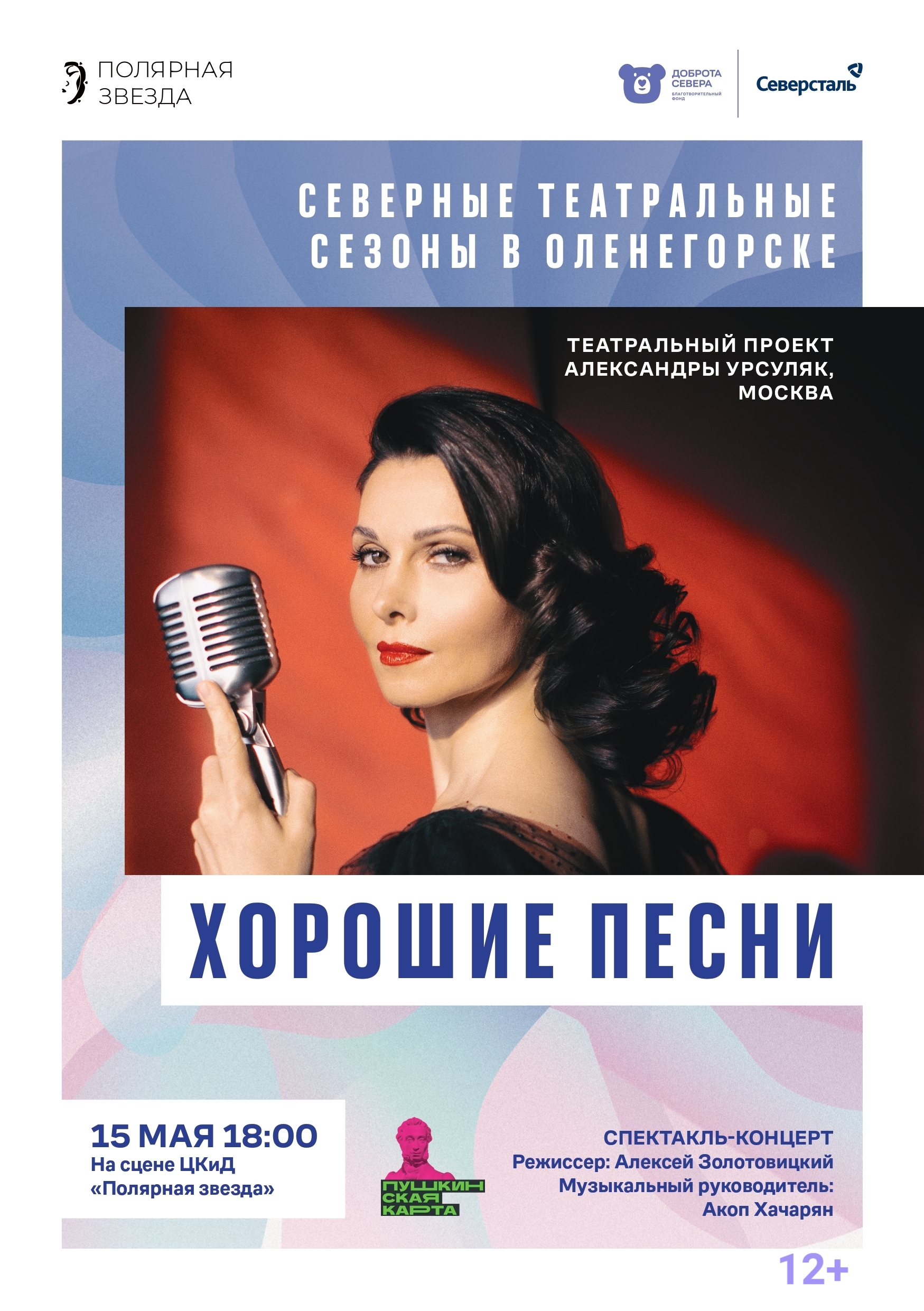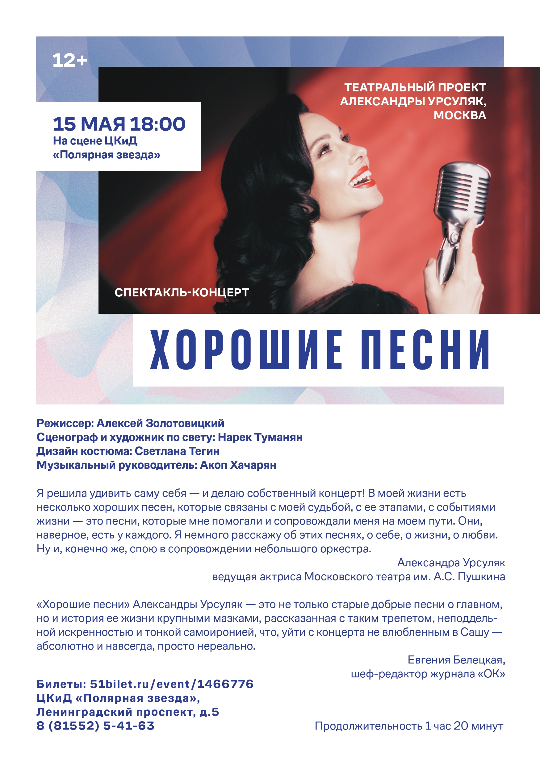 15 мая в 18:00 на сцене Центра культуры и досуга «Полярная звезда» актриса Московского драматического театра им. А. С. Пушкина, дважды лауреат премии «Золотая Маска» Александра Урсуляк представит свой авторский проект «Хорошие песни».