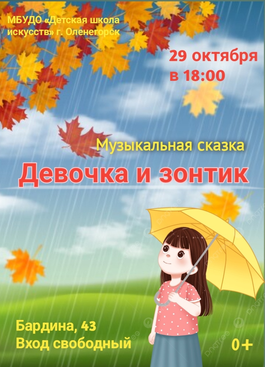 А 29 октября в 18 часов там же, на Бардина, 43 — премьера музыкальной сказки «Девочка и зонтик», в ролях ученики хорового отделения, 0+.