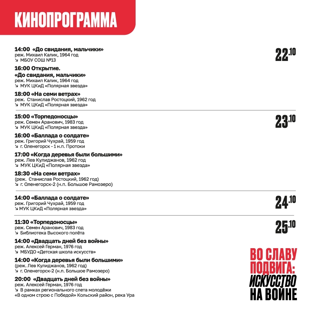 Продолжается показ кинопрограммы «Во славу Подвига: искусство на войне» — место и время смотрите на афише, 12+.