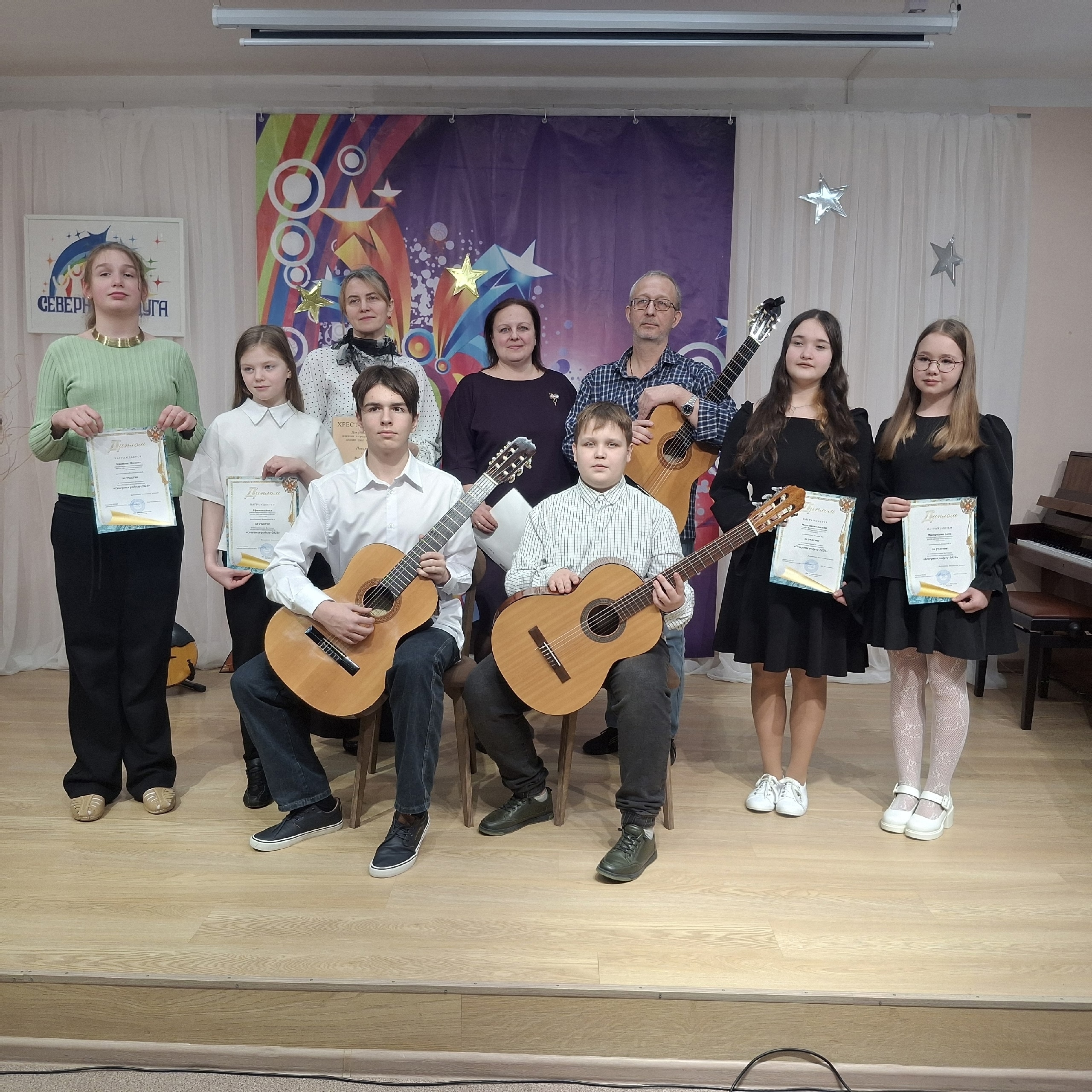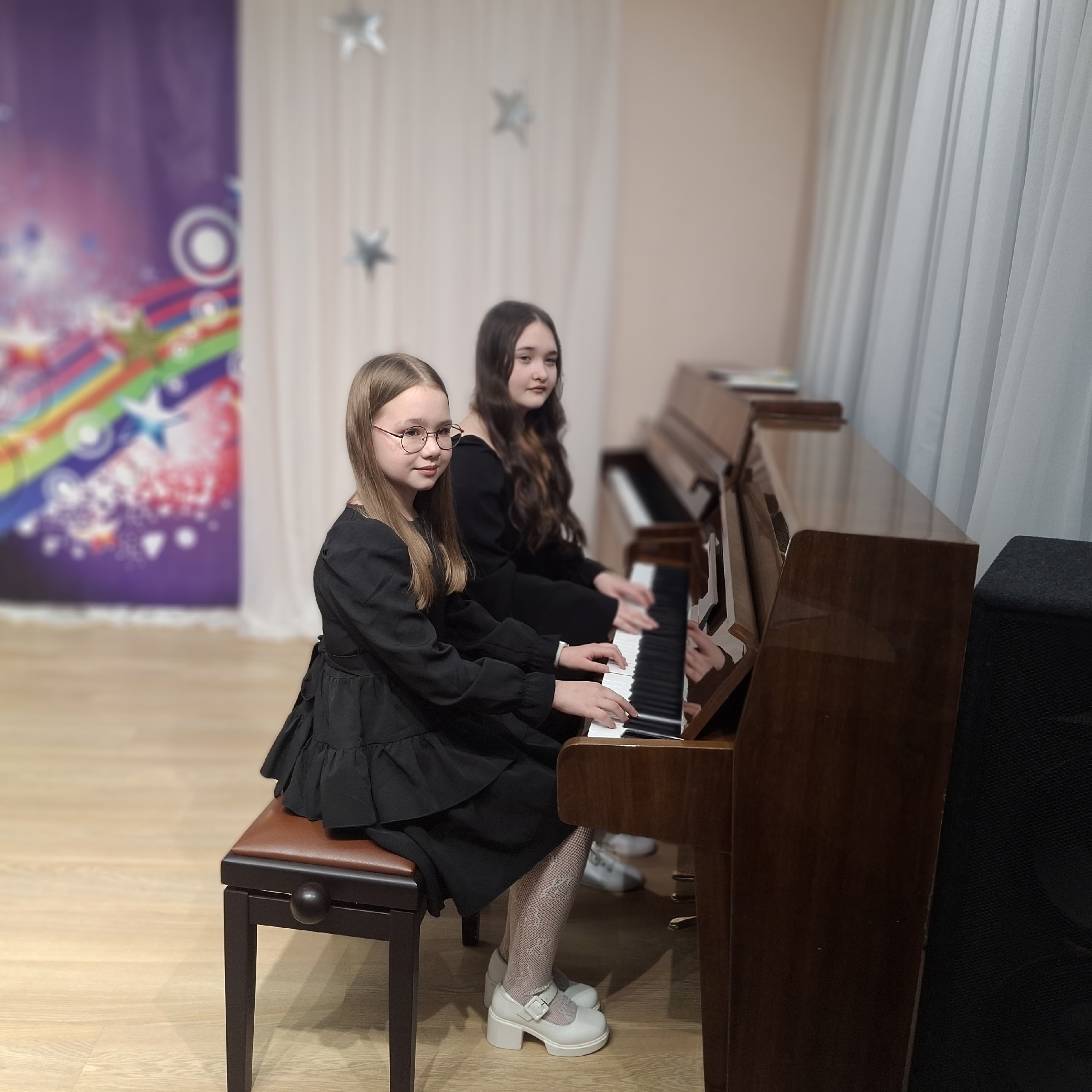Артисты Детской школы искусств выступили на VI муниципальном фестивале ансамблевого исполнительства «Северная радуга‑2026» — они представили два дуэта и одно трио.