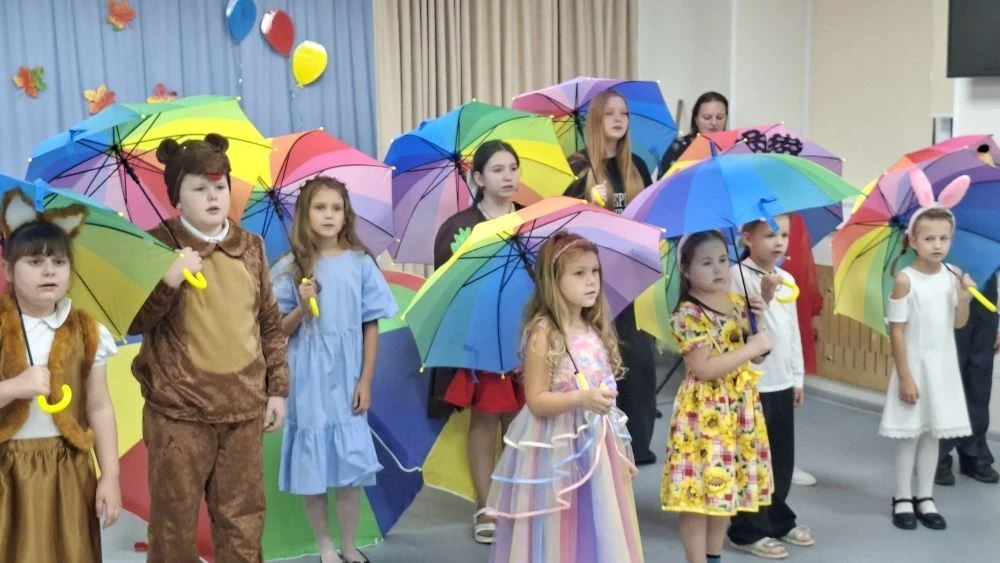 Юные артисты подарили ребятам незабываемое представление — сказку «Девочка и зонтик». Музыкальный зал наполнился весёлыми песенками, пронизанными осенним настроением. Благодаря талантливой игре актеров зрители окунулись в волшебный мир, где встретились озорной зайчик, хитрый волк, добродушный мишка, шустрый воробышек и, конечно, главная героиня Соня с волшебным зонтом.