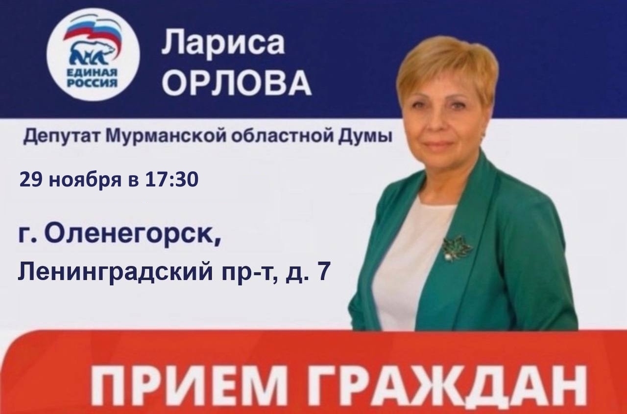 Депутат Мурманской областной думы Лариса Орлова 29 ноября в 17.30 часов проведет личный приём граждан в общественной приемной партии «Единая Россия» по адресу: пр-кт Ленинградский, д. 7.