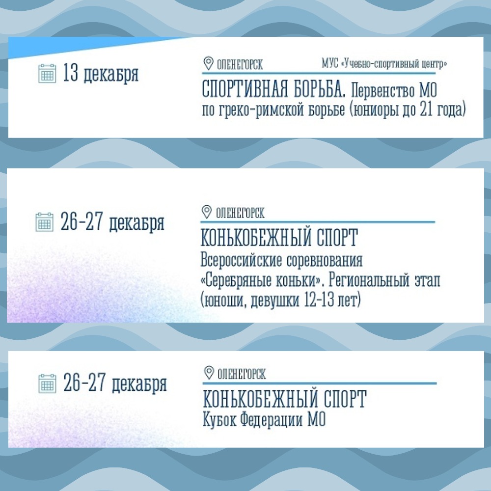 Министерство спорта Мурманской области опубликовало афишу спортивных мероприятий региона на декабрь 2025 года. В Оленегорске состоится три масштабных события: — Первенство Мурманской области по греко-римской борьбе — Региональный этап Всероссийских соревнований Серебряные коньки» по конькобежному сорту — Кубок Федерации конькобежного спорта Мурманской области