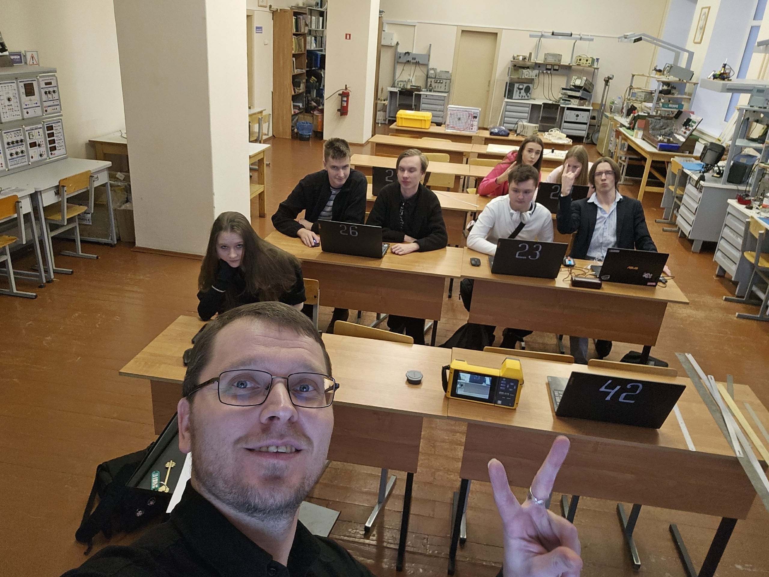 В учебной лаборатории атомной физики и спектроскопии под руководством старшего преподавателя Евгения Сергиянского учащиеся: