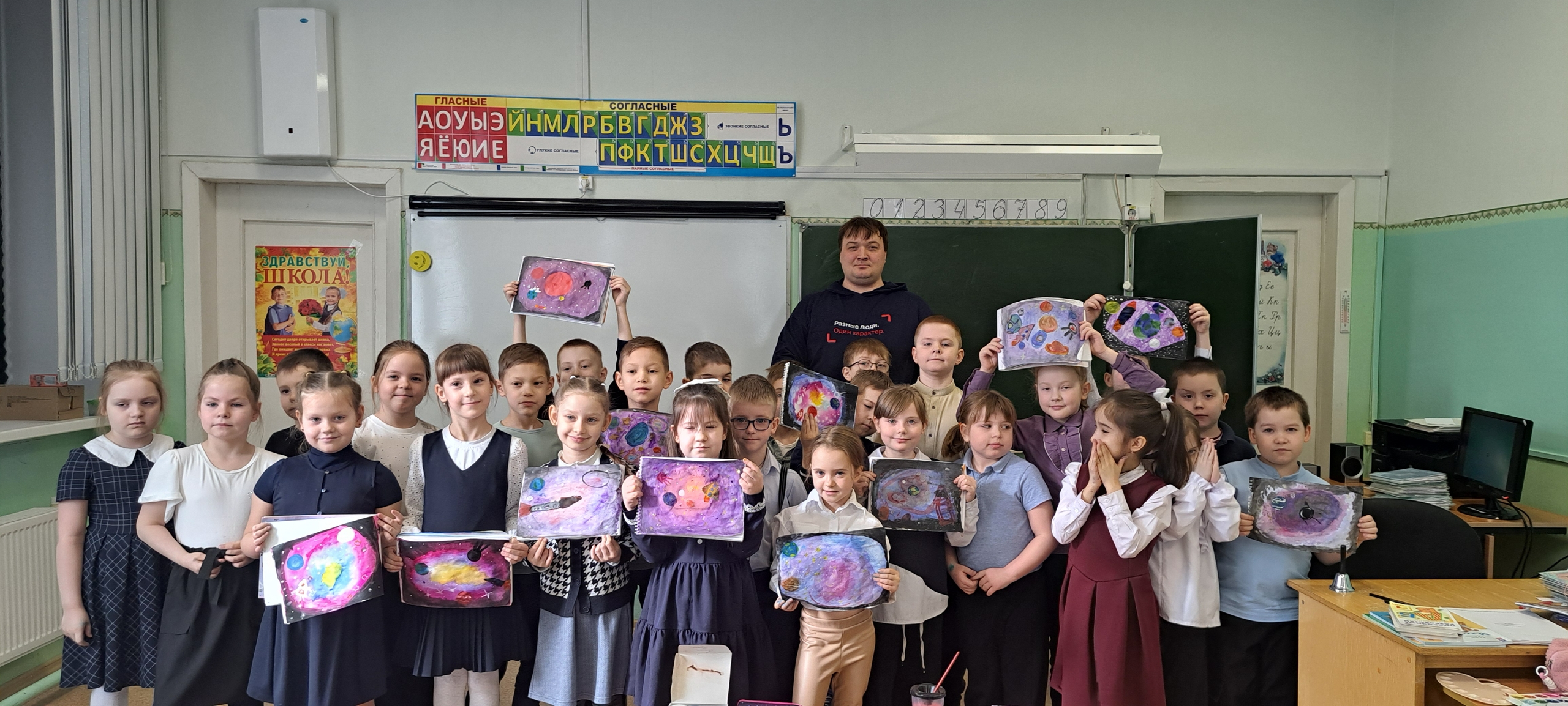 Урок был посвящен Дню космонавтики: Владимир учил ребят изображать космос в технике «акварель по‑мокрому» — когда лист перед нанесением краски смачивают водой. Благодаря этому получаются мягкие цветовые переходы и воздушные эффекты, а результат всегда немного непредсказуем.