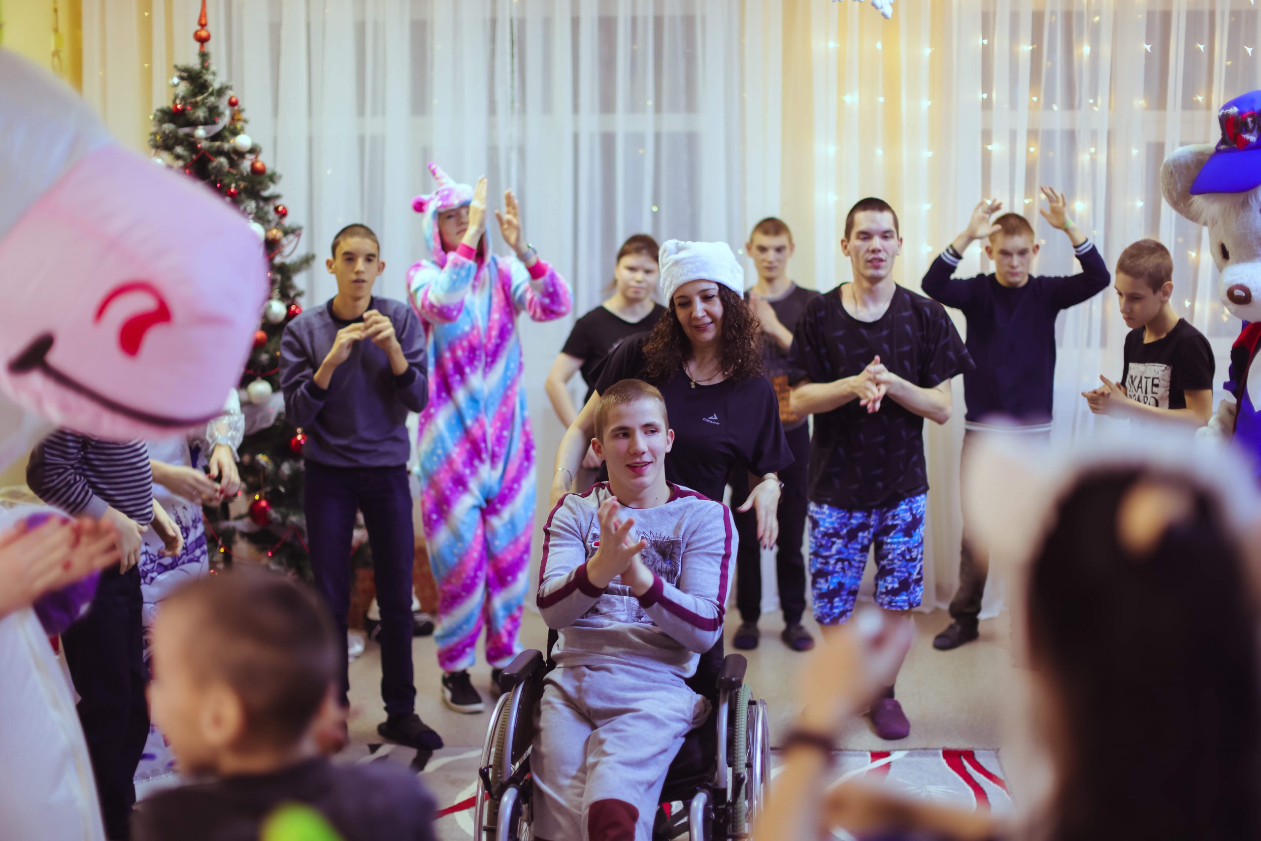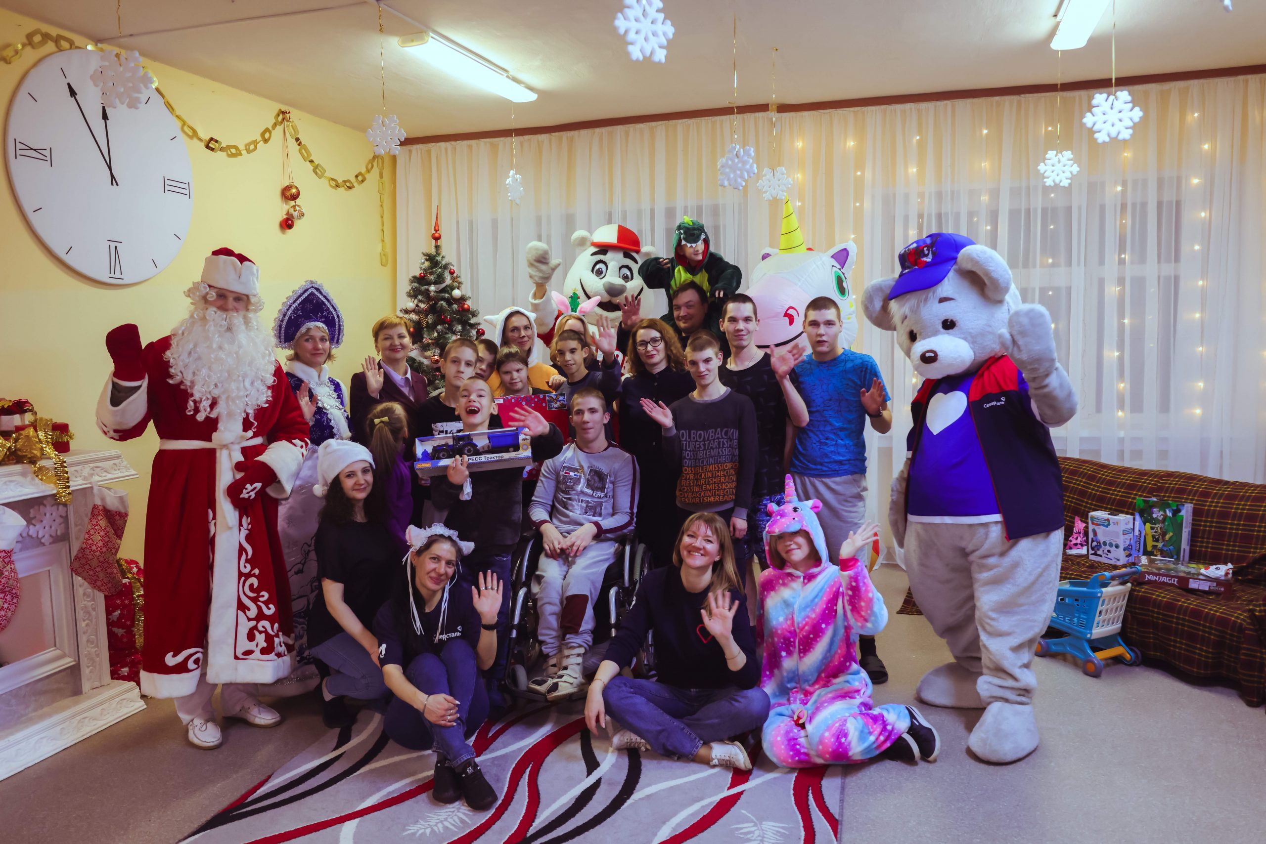 Ребят, постоянно проживающих в КШИ, навестил настоящий сказочный десант: единороги, динозаврик, лиса, два полярных мишки, а также Дед Мороз со Снегурочкой. Гости пришли поздравить детей и вручить подарки.