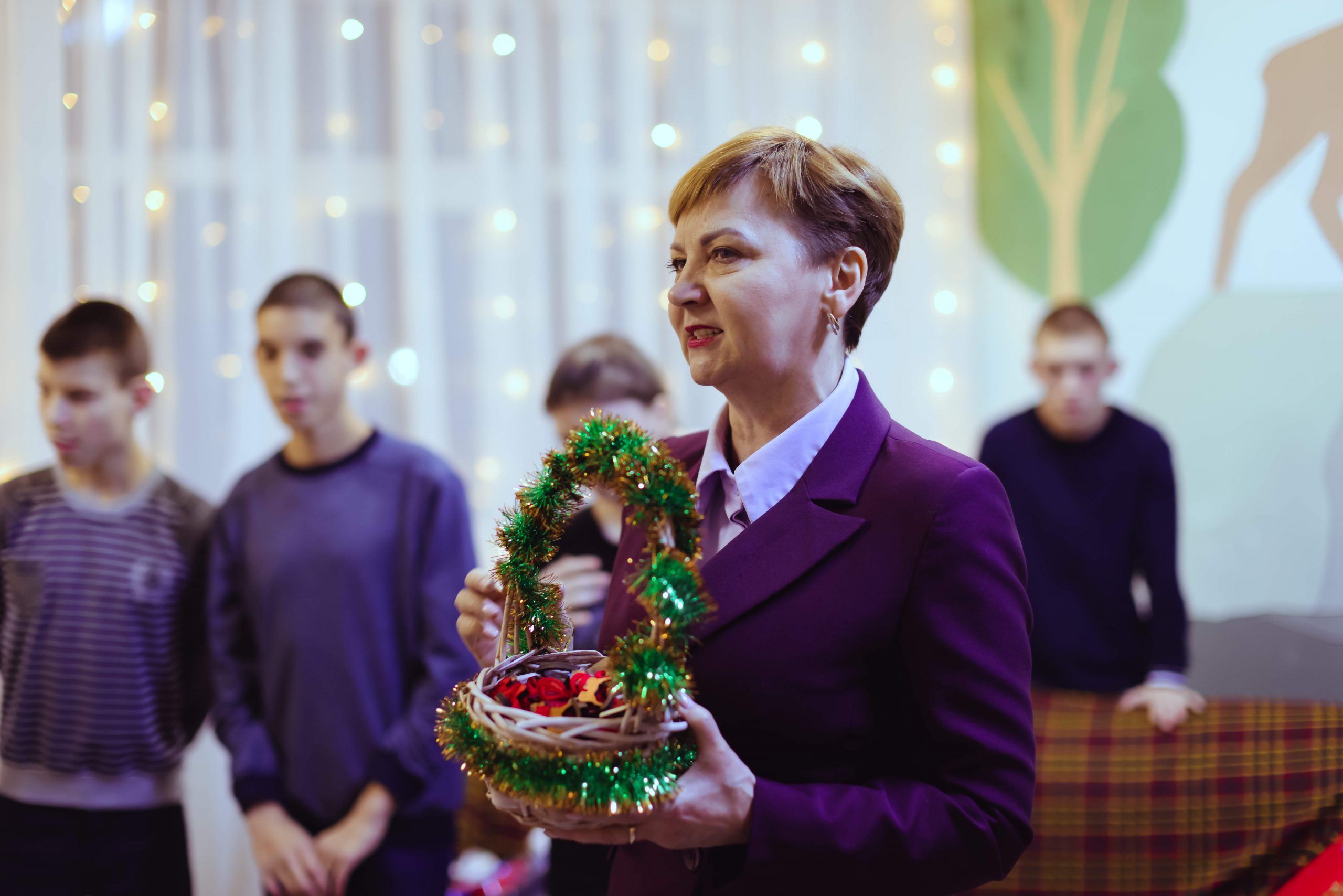 Директор школы‑интерната Валентина Решетова от имени всего коллектива поблагодарила гостей. Она вручила благодарственное письмо Ксении Селивановой, начальнику отдела коммуникаций, куратору корпоративного волонтерского движения «Олкона». А все участники творческой группы получили сувениры — елочные игрушки, сделанные детскими руками.